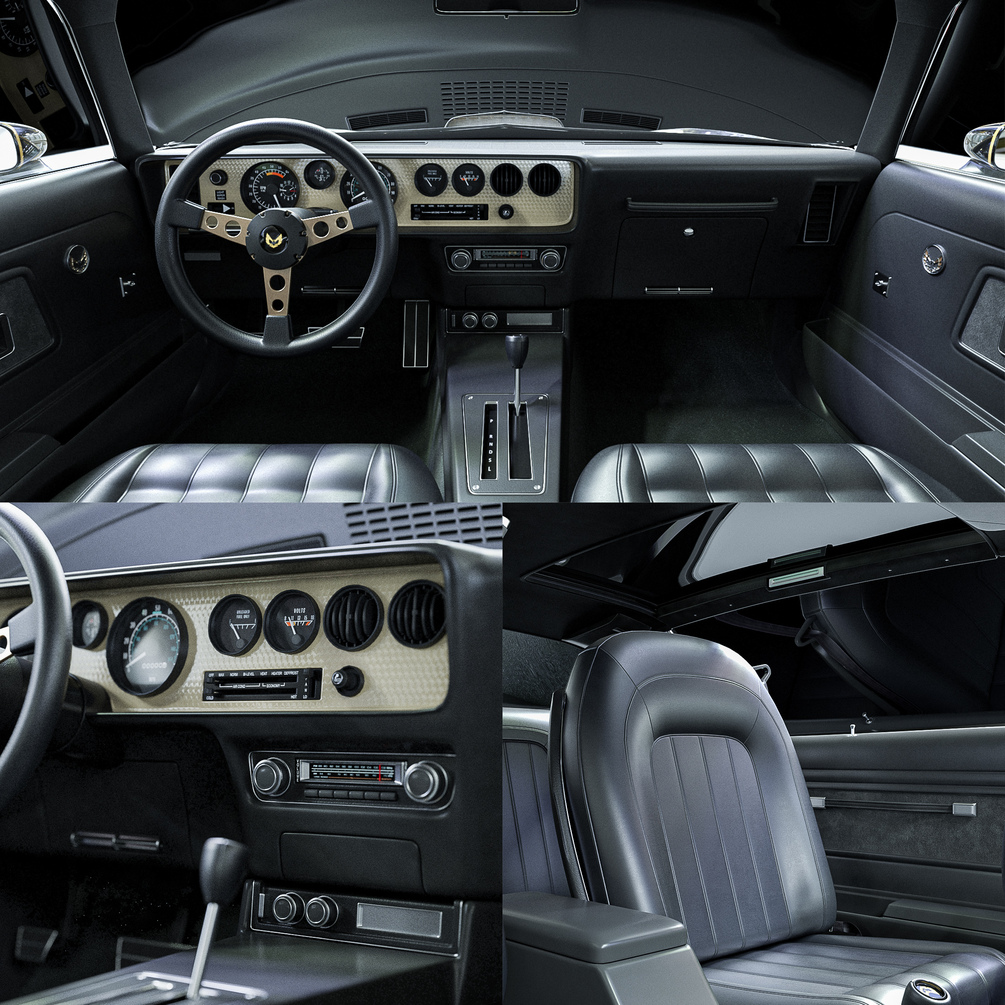 The 1977 Firebird Trans Am Special Edition is easily identified by its Starlight Black paint, gold striping, gold grille inserts, and gold accented snowflake wheels. Other standard equipment includes a rear decklid spoiler, dual chrome splitter exhaust extensions, and front air dam. The interior features a gold engine-turned instrument bezel, gold-accented steering wheel, and red Firebird emblems.
